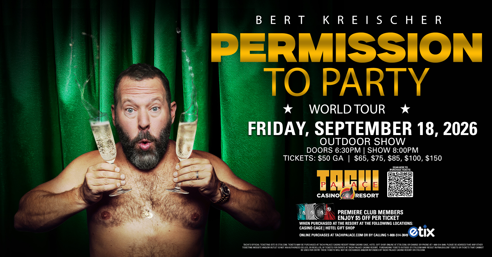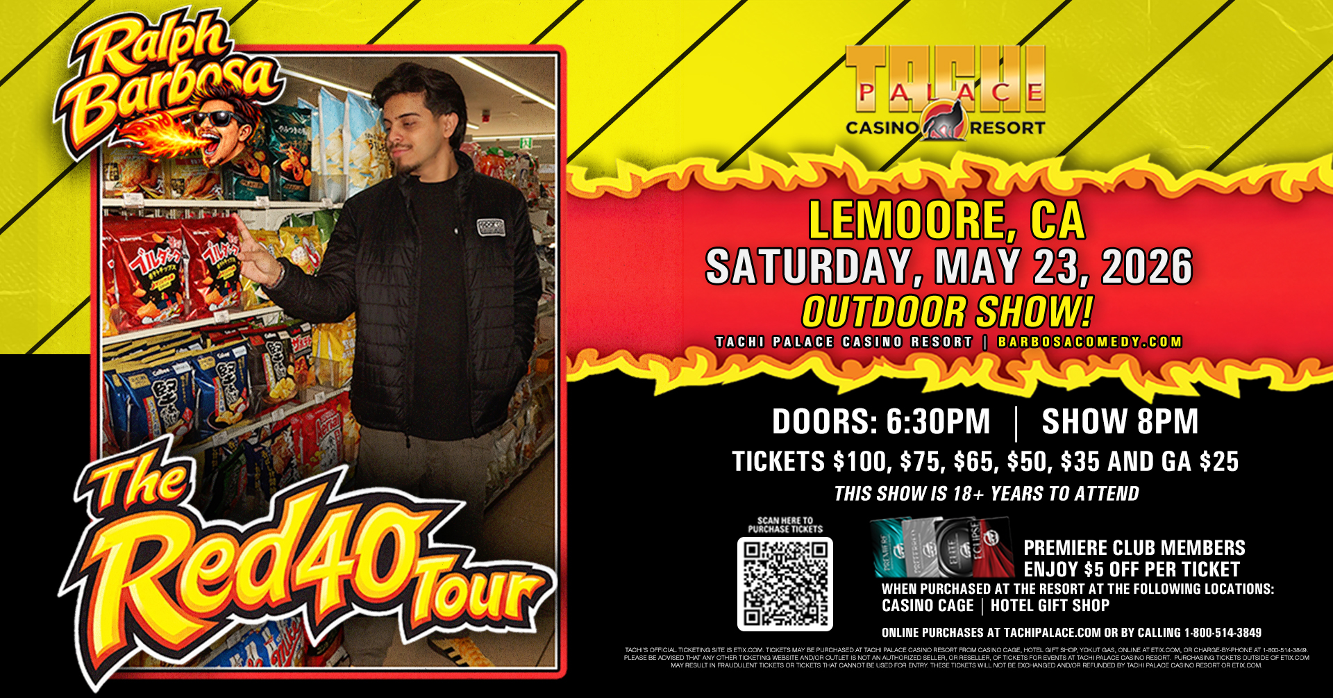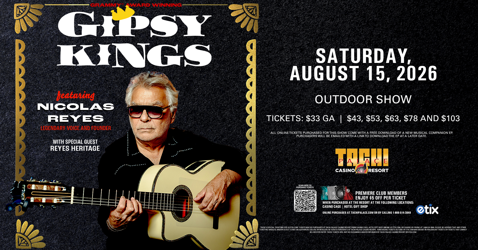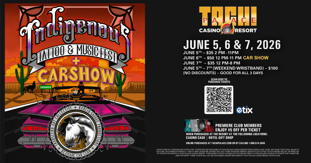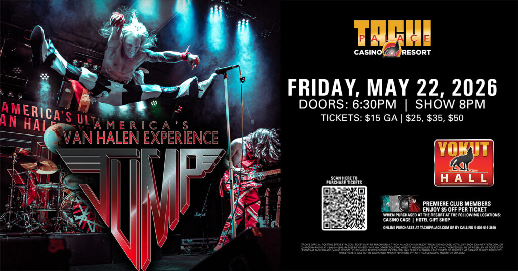 Tickets for events at Tachi Palace are sold via our authorized ticketing partner, ETIX.com. You will be redirected to ETIX.com to complete your purchase. Tickets may be purchased at Tachi Palace Casino Resort from Casino Cage, CEC Concessions, Yokut Gas, online at ETIX.com, or charge-by-phone at 1-800-514-3849. Please be advised that any other ticketing website and/or outlet is not an authorized seller, or reseller, of tickets for events at Tachi Palace Casino Resort. Purchasing tickets outside of ETIX.com may result in fraudulent tickets or tickets that cannot be used for entry. These tickets will not be exchanged and/or refunded by Tachi Palace Casino Resort or Etix.com.
